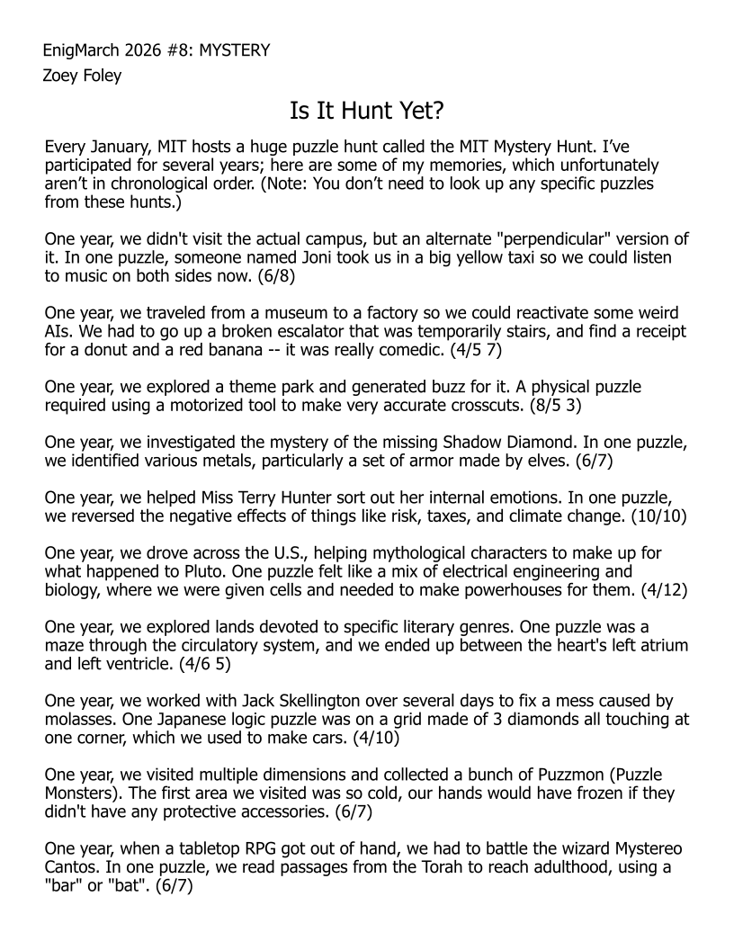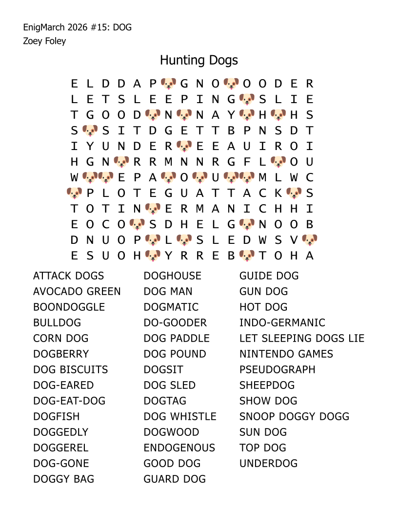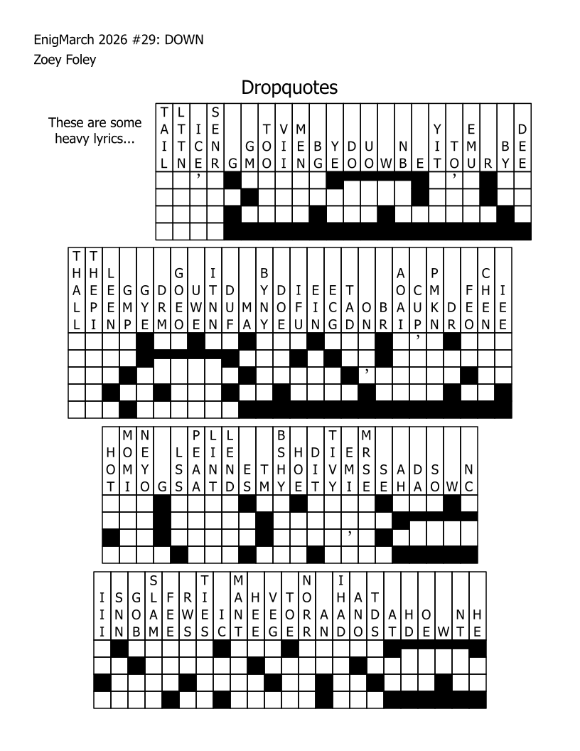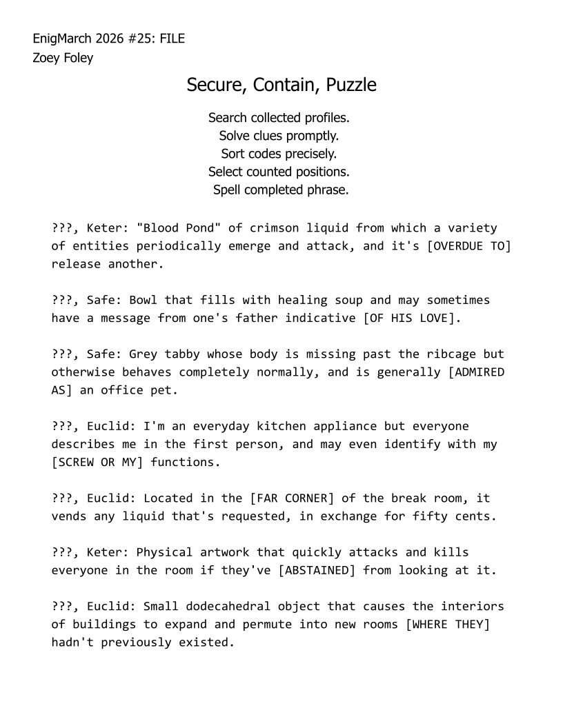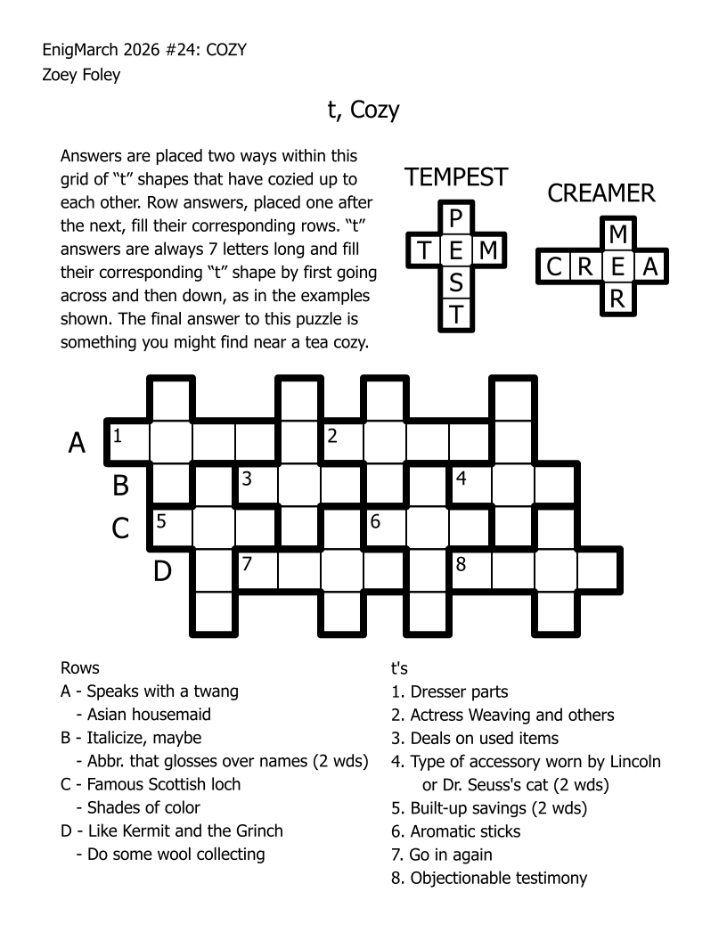 For the month of March 2022, a puzzle prompt was provided each day by Enigmarch. Below are the puzzles Zoey has made for the challenge.