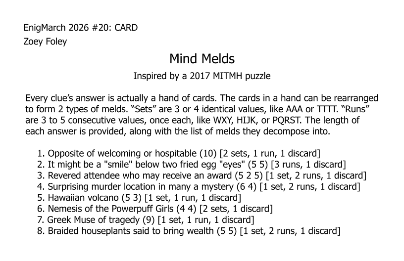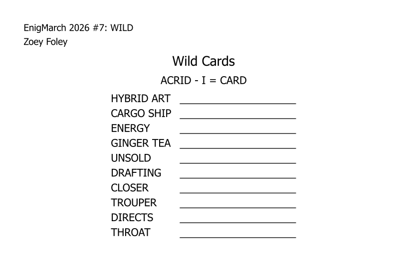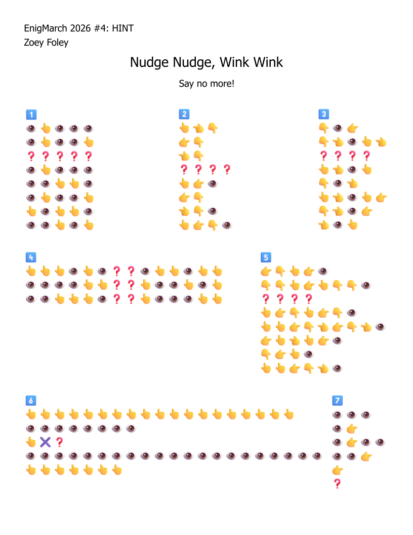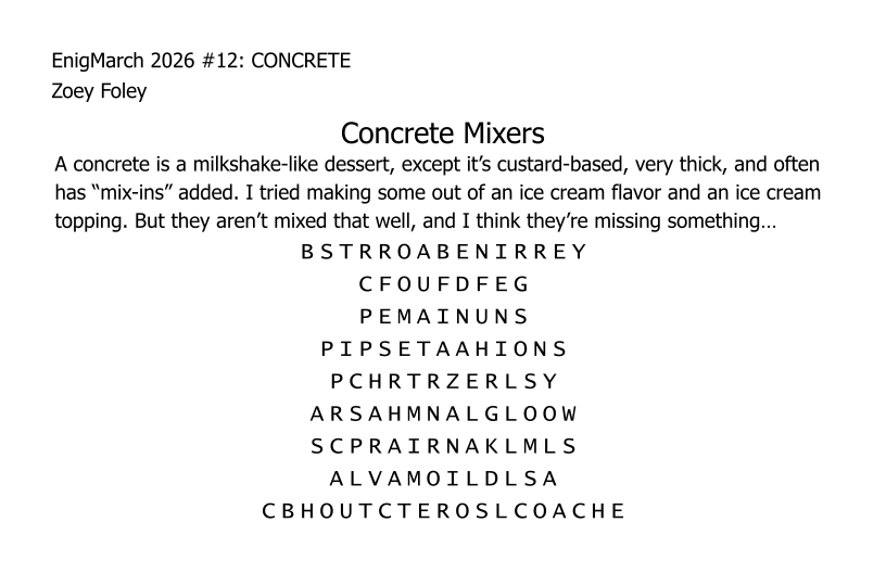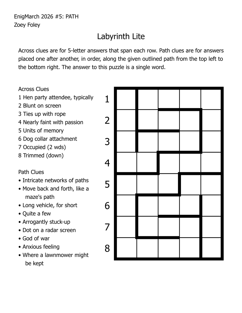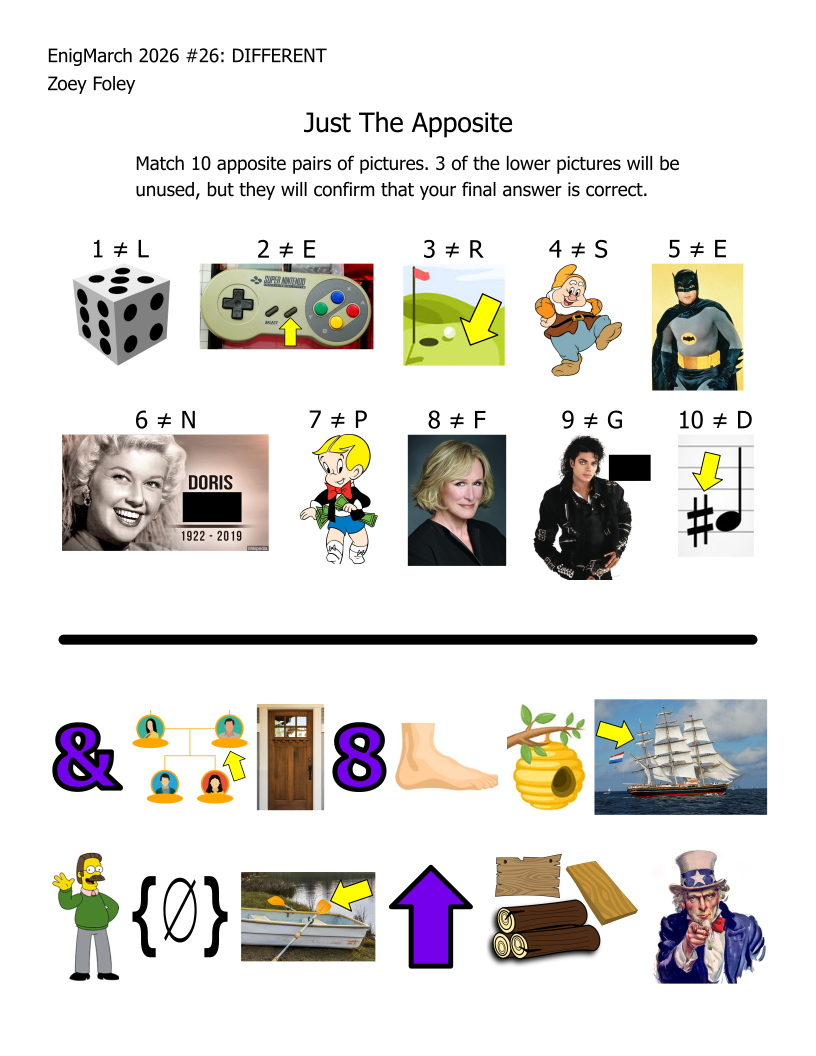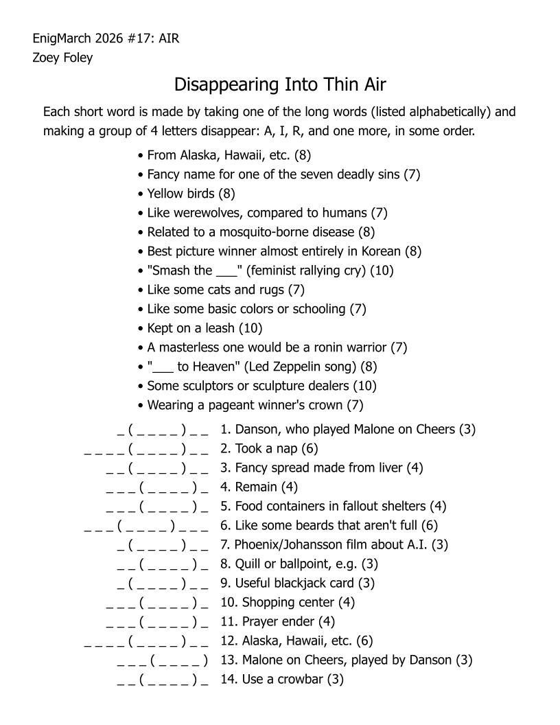 For the month of March 2022, a puzzle prompt was provided each day by Enigmarch. Below are the puzzles Zoey has made for the challenge.