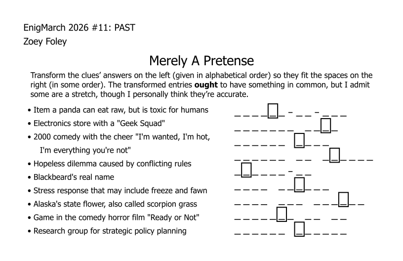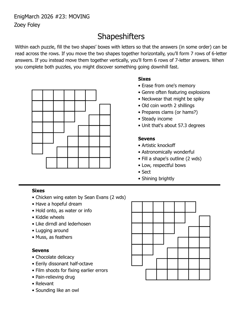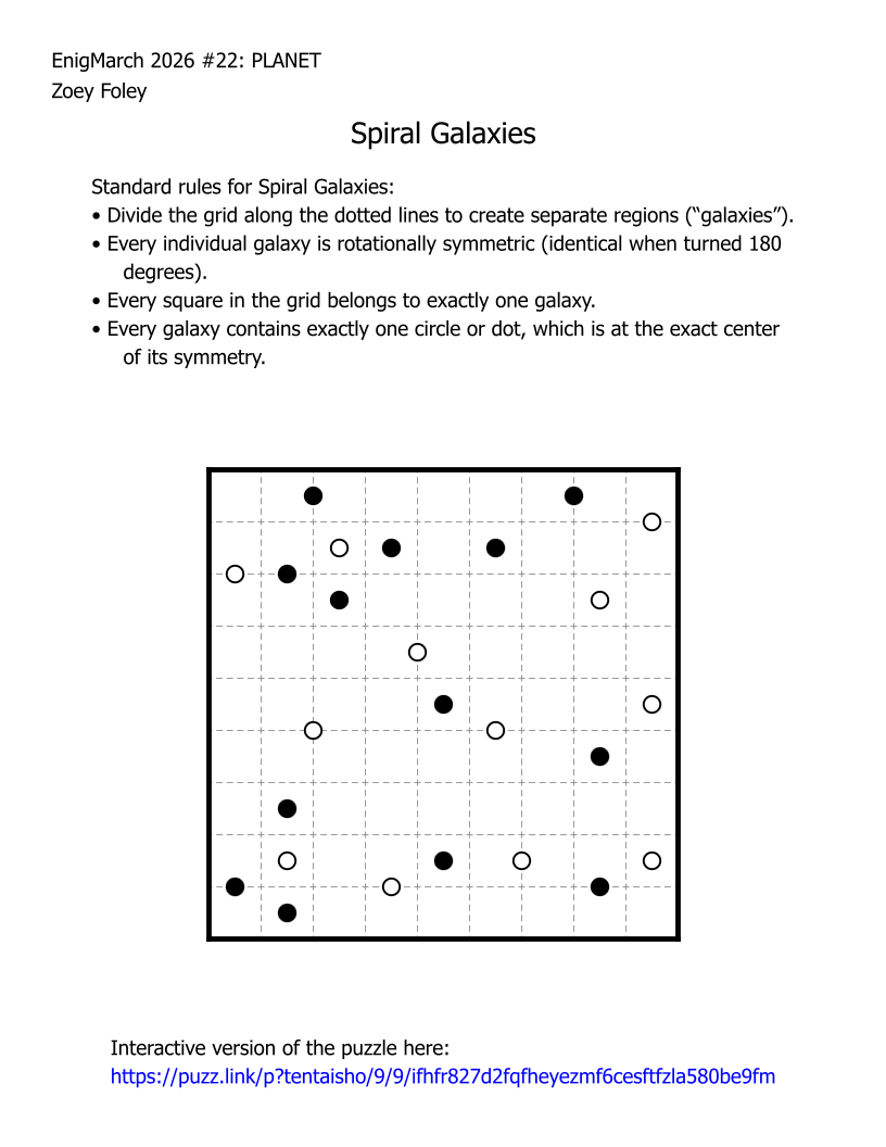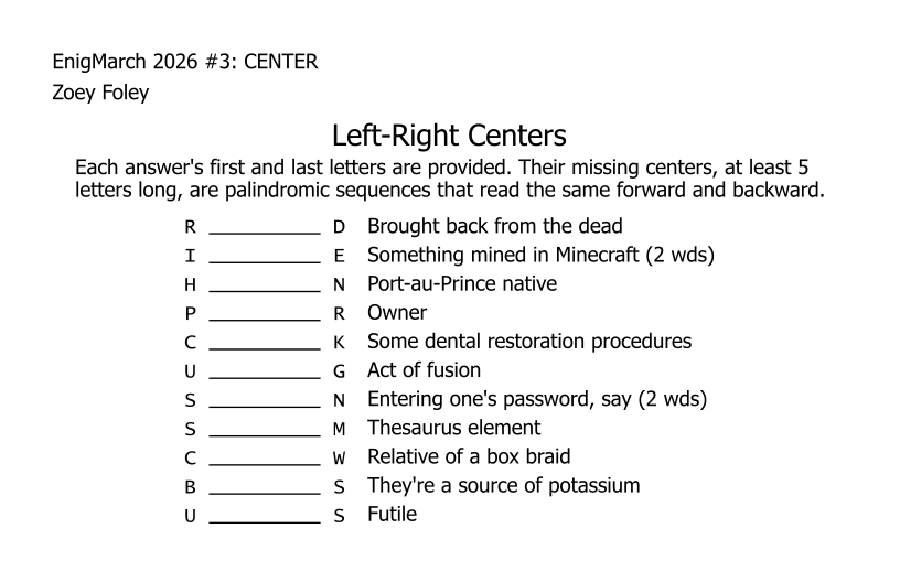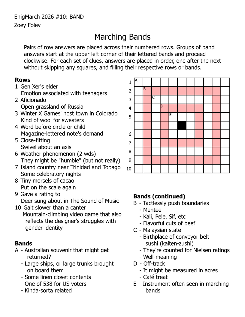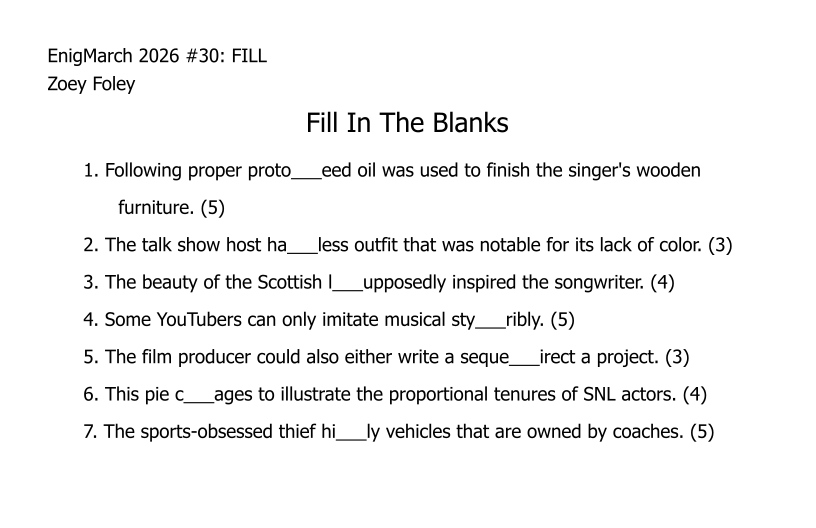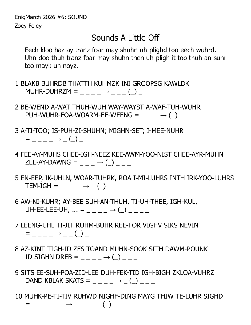 For the month of March 2022, a puzzle prompt was provided each day by Enigmarch. Below are the puzzles Zoey has made for the challenge.